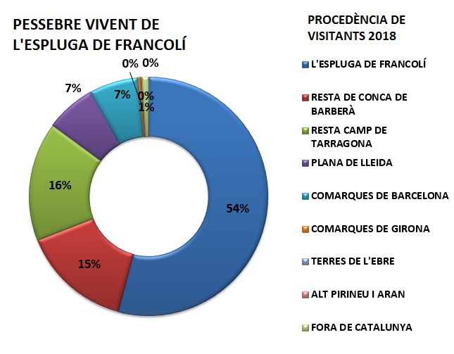 Com ja va passar en l’edició del 2015, els visitants procedents de les comarques del Camp de Tarragona són el potencial més important, ja que –sumant els de l’Espluga i la resta de la Conca-, han suposat en aquest cas el 85% dels visitants del Pessebre Vivent (un 5% més que el 2015). De fet, els visitants procedents de la resta de pobles de la comarca han suposat el 15% dels visitants, la majoria procedents de Montblanc. De la resta del Camp de Tarragona (el 16% del total), la majoria venien de les ciutats de Tarragona, Reus i Valls, també municipis com Alcover o Vila-seca, el Pla de Santa Maria o el Vendrell, el Pont d’Armentera i el Pla de Penedès.