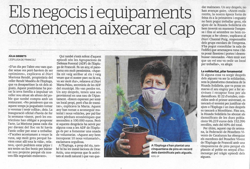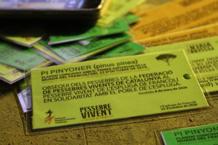 La Federació de Pessebres Vivents de Catalunya i l‘Associació del Pessebre Vivent de l’Espluga han repartit aquest divendres 48 pins pinyoners -un en representació de cada Pessebre Vivent català federat- entregats el 8 de marc, just abans de la pandèmia, a l’assemblea general de la Federació a Peralada, en solidaritat amb els afectats i en homenatge al voluntariat i al poble de l’Espluga per la Riuada del Francolí del 22 d’octubre de 2019. Va ser llavors quan la representant del Pessebre de l’Espluga a la Federació de Pessebres Vivents i tresorera de la mateixa, Núria Giné, va rebre personalment els arbrets.
