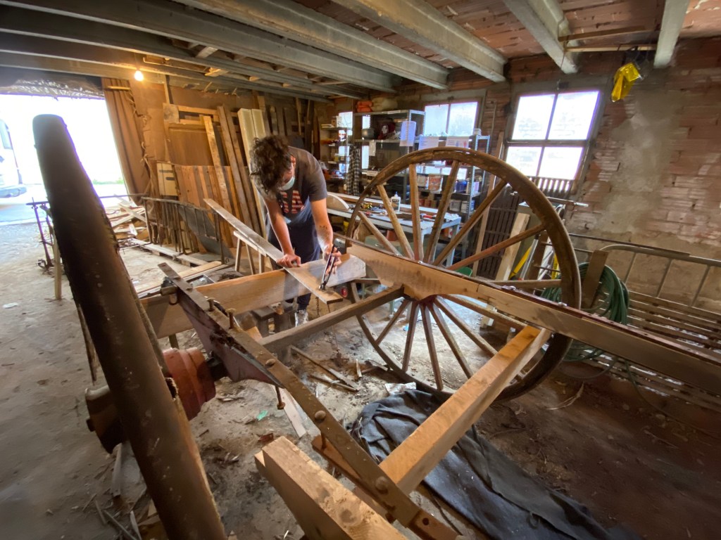 Tasques de muntatge i restauració d’un antic carro de pagès. Feines de fusteria.