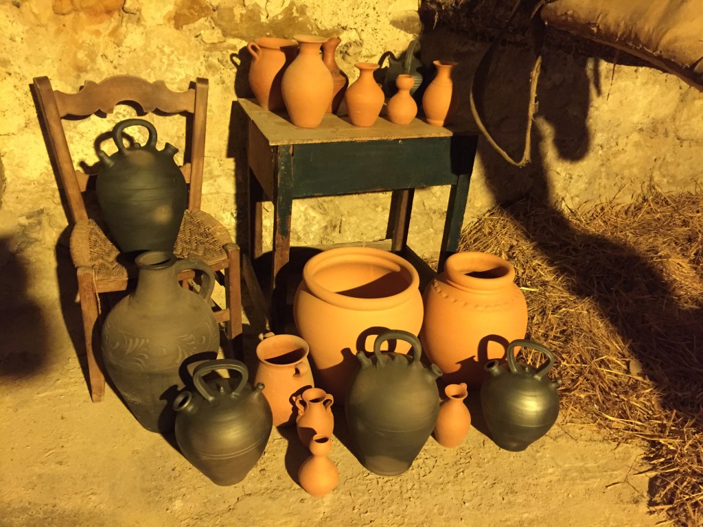 Cistells i utillatge d’espart o vímet, gerres i utillatge de cuina, ceràmica i aram, vidrebufat, també robes i teles no estampades, de colors llisos i terrosos o foscos, mantes del mateix to, tendals i borrasses velles i de sac.