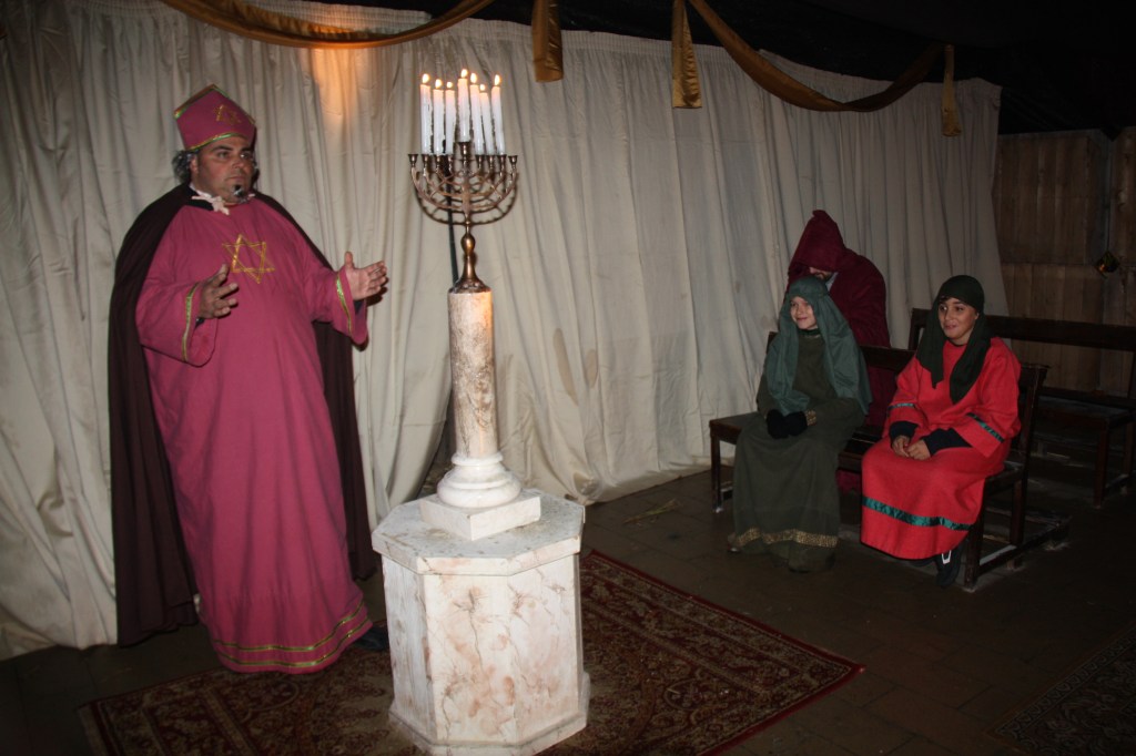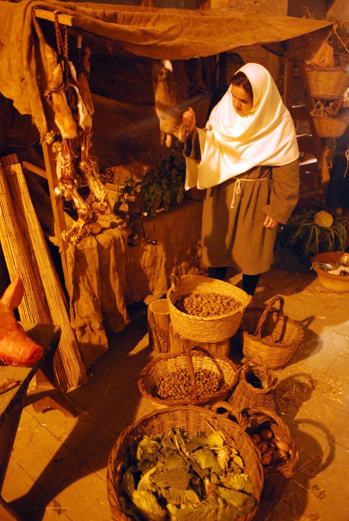 A l’exterior, al lateral de l’església Vella s’hi instal·lava el mercat jueu amb diferents parades de roba i alimentació, a més de l’escena de l’empadronament.