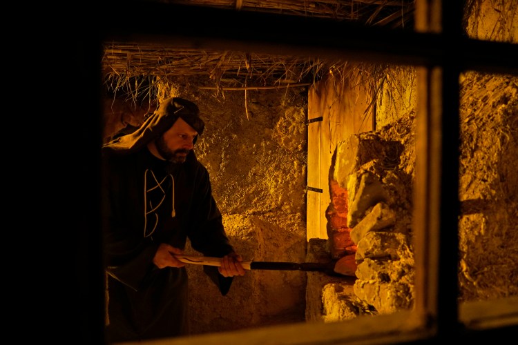 De la domesticació del camp, l’elaboració del pa n’és el gran exponent. El pa jueu, principal aliment de la seva dieta, s’elabora amb blat molt en pedra, una tasca que corresponia a les dones de la família, juntament amb l’elaboració del pa, encara que amb el creixement de les poblacions els homes van començar a fer de forners. El pa s’acompanya amb llet, mel, dàtils o formatge. Durant el temps de la Pasqua jueva, s’elaborava el pa àzim, sense llevadura, només amb aigua i farina. A l’Espluga de Francolí va localitzar-se un segell hebraic del segle XIV, reproduït en aquesta escena, sobre la taula, on pot llegir-se el verset del llibre de l’Èxode XIII: “Durant 7 dies menjareu àzims en pau”. A l’esquerra de l’escena, l’obrador del pa, sota els murs i arcs originals de l’Espluga del segle XIV.